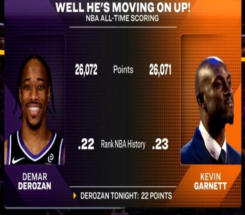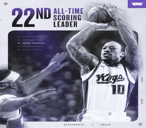 排在德罗赞身前的为斯蒂芬·库里(截至今日为26257分),再往前一位是约翰·哈弗里切克(26395分)。