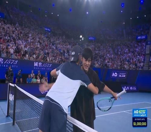体育播报01月14日宣 澳网一球制胜表演赛,外卡身份参赛的周杰伦对阵维多利亚州业余冠军彼得·约维奇。