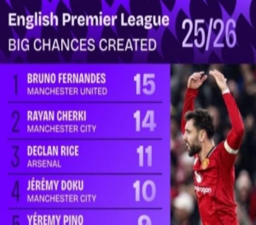 本赛季英超创造重大机会榜:B费15次居首,谢尔基、赖斯二三位