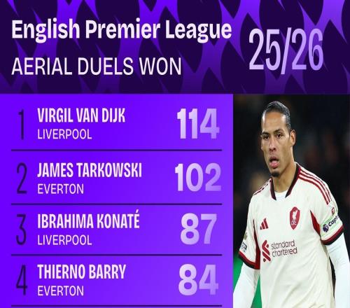 本赛季英超赢得空中对抗排名:范戴克第一,塔尔科夫斯基次席