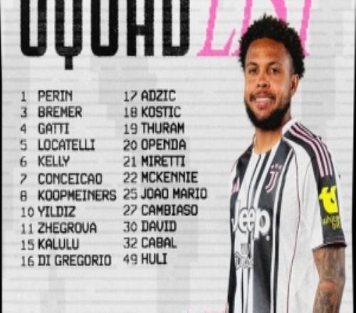 尤文对阵那不勒斯大名单:伊尔迪兹、戴维、麦肯尼、加蒂在列