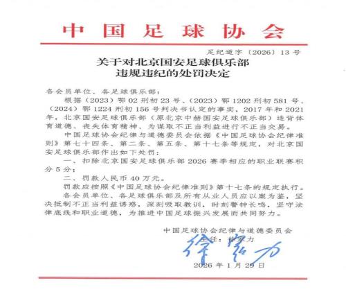 据足协通报披露,北京国安此次受罚,系因2017年及2021年两度存在违背体育道德、背离职业精神、谋求不当利益之行为,最终被处以扣除5个联赛积分、罚款40万元的处罚。