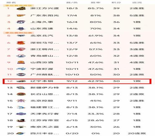 辽宁暂列第12名